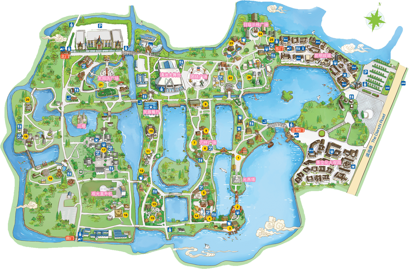彝族在云南境內(nèi)約471萬人,是省內(nèi)人口最多、分布最廣的少數(shù)民族,主要聚居在金沙江、元江流域和哀牢山、無量山腹地。彝族是一個能歌善舞的民族,民間打歌、跳樂之風(fēng)盛行,大三弦、跌腳舞久負(fù)盛名。火把節(jié)是彝族最具特色的民族節(jié)日。彝族村占地50余畝,三虎浮雕墻與虎頭內(nèi)祖師形象表現(xiàn)了彝族虎鷹文化。太陽歷廣場圖騰柱上有太陽、虎、火和八卦圖形象,周圍環(huán)繞著10個朝向不同的月球造型,外圓周有12生肖石雕。依山而建的“...